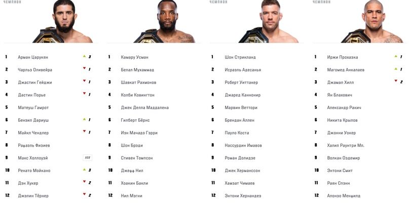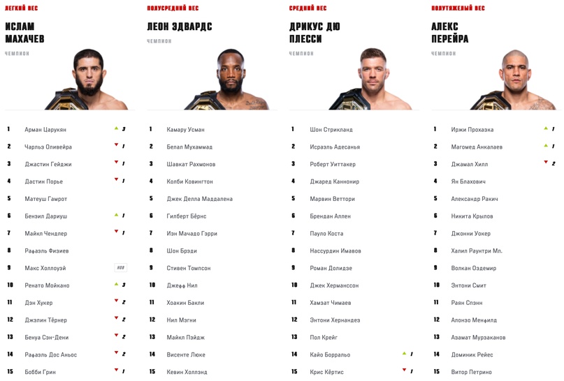 Махачев остается доминирующим чемпионом, хотя и проводит всего один бой в год. Он по-прежнему возглавляет pound-for-pound рейтинг.