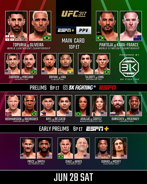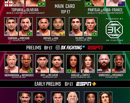 Предварительные поединки турнира UFC 319 начнутся в 01:00 по московскому времени. Главный кард стартует в 05:00. Трансляцию боев можно будет посмотреть на платформе Setanta.